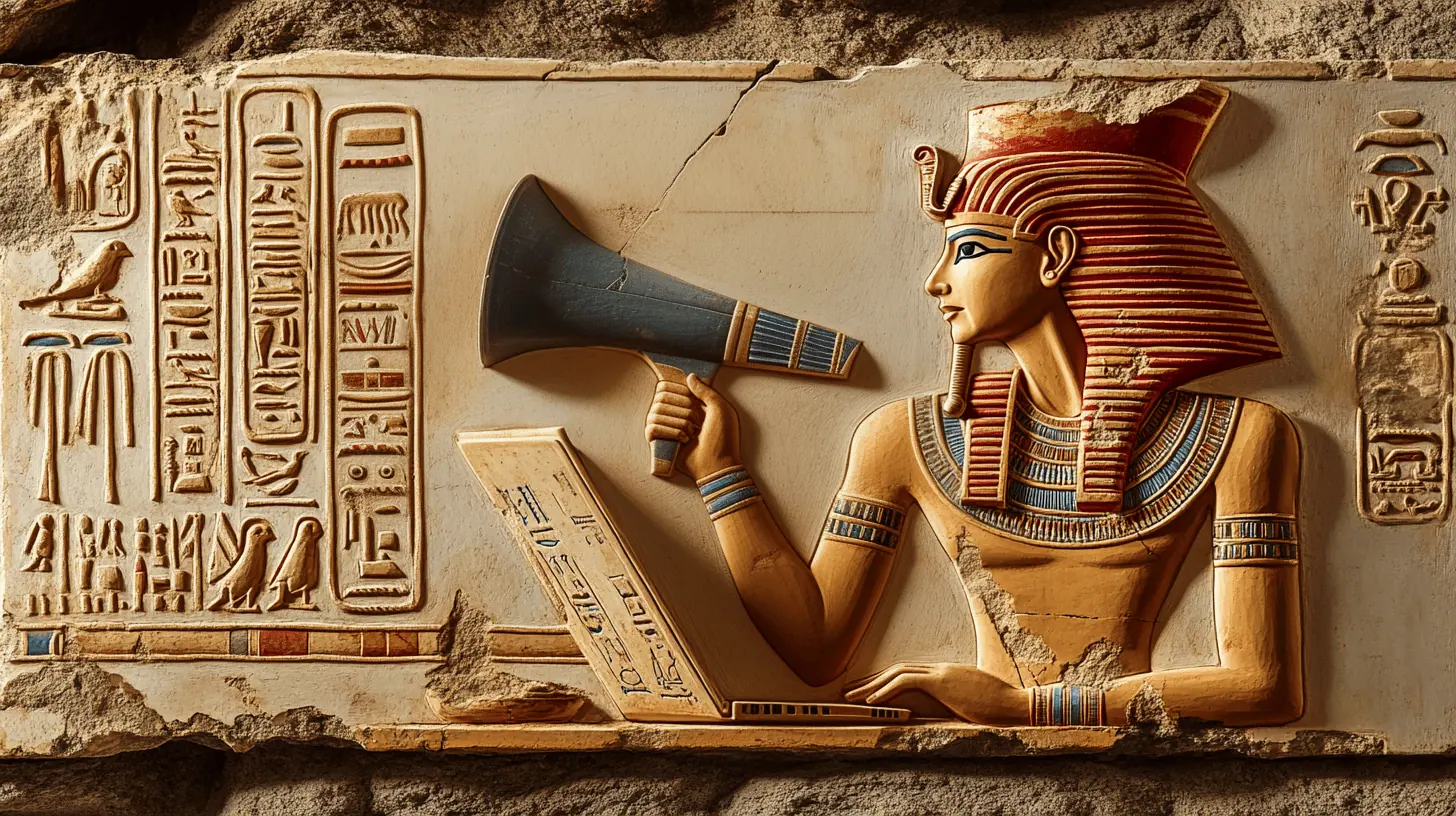 • Esperto Wordpress. Primo piano di un faraone egizio in analisi di un sito web per migliorare performance e sicurezza del cliente.