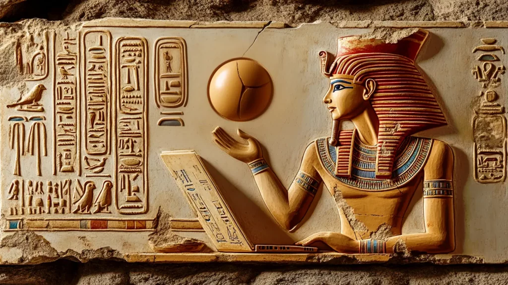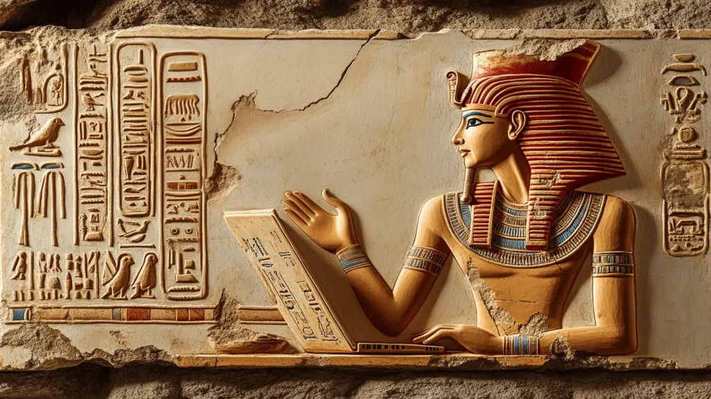 • Marketing automation. Primo piano di un faraone egizio impegnato nella creazione di automazioni della strategia di marketing di un cliente.